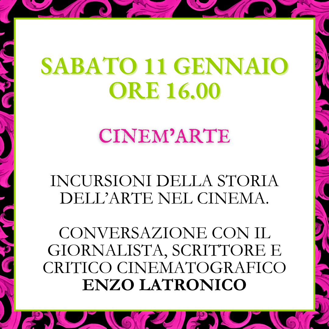 Sabato 11 Gennaio alle ore 16, presso lo Spazio Mostre, si terrà "Cinem'Arte", conversazione con il giornalista, scrittore e critico cinematografico Enzo Latronico, che approfondirà le incursioni del cinema nella storia dell'arte, dove l’iconologia strizza l’occhio al pubblico e l’immagine si fa messaggio diventando un nuovo linguaggio con messa in scena e tempi di lettura intrinsechi.